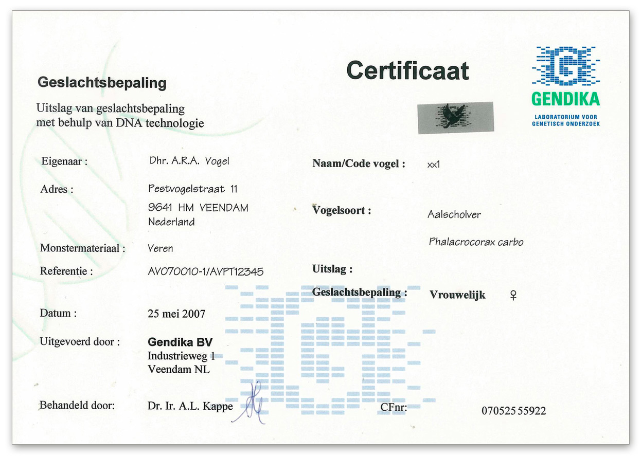 - Direct na de voltooiing van de analyses krijgt u van ons per post een rapport met daarin de resultaten van de analyses en per vogel een geplastificeerd certificaat. Indien uw e-mail adres bij Gendika bekend is, krijgt u tevens de resultaten per mail.